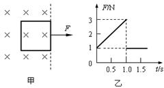 5、选择题 一正方形金属线框位于有界匀强磁场区域内,线框平面与磁场垂直,线框的右边紧贴着磁场边界,如图甲所示。t=0时刻对线框施加一水平向右的外力F,让线框从静止开始做匀加速直线运动穿过磁场。外力F随时间t变化的图线如图乙所示。已知线框质量m=1kg、电阻R=1Ω。以下说法正确的是