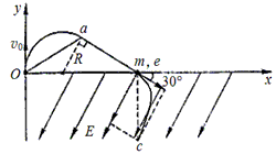 1、计算题 如图所示,在坐标系xOy中,过原点的直线OP与x轴正向的夹角,在OP上方存在磁感应强度为B的匀强磁场区域,磁场方向垂直纸面向外,其左边界为y轴、右边界与直线OP重叠;第四象限存在匀强电场,场强大小为E,方向沿与x轴负方向成的角斜向下。一个质量为m,带电量为+e的质子以速度v0从O点沿y轴正方向射入匀强磁场区域。质子飞出磁场区域后,从b点穿过x轴进入匀强电场中,之后通过了b点正下方的c点(图中没有画出)。不计质子的重力。求:
