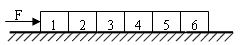 1、填空题 用水平恒力F推动放在光滑水平面上、质量均为m的六个紧靠在一起的木块,如图所示。则第5号木块受到的合外力等于______________,第4号木块对第5号木块的作用力等于______________。