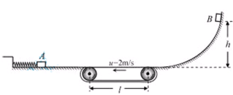 5、计算题 (20分)如图所示,装置的左边是足够长的光滑水平面,一轻质弹簧左端固定,右端连接着质量 M=2kg的小物块A。装置的中间是水平传送带,它与左右两边的台面等高,并能平滑对接。传送带始终以u="2m/s" 的速率逆时针转动。装置的右边是一光滑的曲面,质量m=1kg的小物块B从其上距水平台面h=1.0m处由静止释放。已知物块B与传送带之间的摩擦因数μ=0.2,l=1.0m。设物块A、B中间发生的是对心弹性碰撞,第一次碰撞前物块A静止且处于平衡状态。取g=10m/s2。