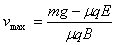 1、计算题 如图所示,在互相垂直的水平方向的匀强电场(E已知)和匀强磁场(B已知)中。有一固定的竖直绝缘杆,杆上套一个质量为m,电荷量为-q的小球,它们之间的动摩擦因数为μ,现由静止释放小球,试分析小球运动的加速度和速度的变化情况,并求出最大速度(mg>μqE)。