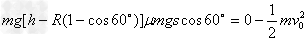3、计算题 如图所示,AB与CD为两个对称斜面,其上部足够长,下部分别与一个光滑的圆弧面的两端相切,圆弧的圆心角为120°,半径R为2.0m,一个物体在离弧底(E)高度h为3.0m处,以初速度4.0m/s沿斜面运动。若物体与两个斜面的动摩擦因数μ均为0. 02,则物体在两个斜面上(不包括圆弧部分)一共能走多少米?(取g=10m/s2)