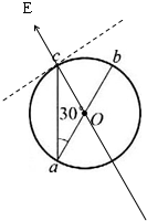 过c点作切线,圆周上其余各点电势都高于c点,即在圆周上找不到与c电势相等的点.且由a到c电场力对小球做正功.则电场方向应在Oc方向,如图.电场方向与线ac间的夹角θ=30°.