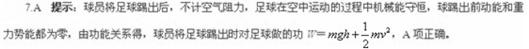 5、选择题 假如在足球比赛中,某球员在对方禁区附近主罚定位球,并将球从球门右上角擦着横梁踢进球门。如图所示,球门的高度为h,足球飞入球门的速度为v,足球的质量为m,则该球员将足球踢出时对足球做的功W为(不计空气阻力)( )