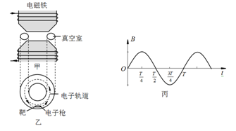5、选择题 电子感应加速器的基本原理如图所示。在上、下两个电磁铁形成的异名磁极之间有一个环形真空室。图甲为侧视图,图乙为真空室的俯视图。电磁铁中通以交变电流,使两极间的磁场周期性变化,从而在真空室内产生感生电场,将电子从电子枪右端注入真空室,电子在感生电场的作用下被加速,同时在洛伦兹力的作用下,在真空室中沿逆时针方向(图乙中箭头方向)做圆周运动。由于感生电场的周期性变化使电子只能在某段时间内被加速,但由于电子的质量很小,故在极短时间内被加速的电子可在真空室内回旋数10万以至数百万次,并获得很高的能量。若磁场的磁感应强度B(图乙中垂直纸面向外为正)随时间变化的关系如图丙所示,不考虑电子质量的变化,则下列说法中正确的是