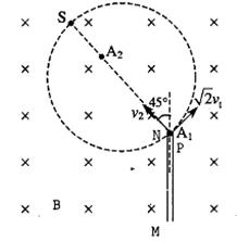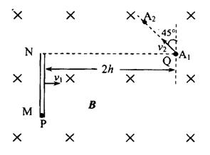 4、计算题 如图所示,在光滑绝缘水平面上平放着一内壁光滑、绝缘的空心细管,管内M端有一带正电的小球P,在距离管的N端正右方2h的A1处有另一不带电的小球Q,存足够大空间区域有竖直向下的匀强磁场,磁感强皮为B。现让细管以垂直管长方向的速度v1水平向右匀速运动,同时让Q以某速度v2从A1点出发沿A1A2匀速运动,细管运动到A1处时,A1A2与细管延长线的夹角为45°。若小球P恰好在A处相对水平面以速度