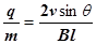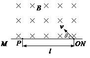 3、计算题 图中MN表示真空室中垂直于纸面的平板,它的一侧有匀强磁场,磁场方向垂直于纸面向里,磁感应强度大小为B。一带正电粒子从平板上狭缝O处以与平板成θ的初速度v射入磁场区域如图,最后到达平板上的P点。已知B、v以及P到O的距离l,不计重力,求此粒子的电荷量q与质量m之比。