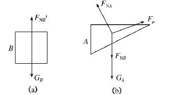 于是受到B的压力FNB和斜面支持力FNA的作用;又因物体A沿斜面匀速下滑,所以它的下表面还受到斜面对它的摩擦力Fμ,那么A的上表面是否受摩擦力作用?这从A物体的受力及运动状态难以作出判断(为什么?),我们可以转换思路,以B为研究对象,它与A一起做匀速运动,因此,它只可能受到竖直方向的重力GB和支持力FNB′这一对平衡力作用,不可能在水平方向上再受到摩擦力作用,如下图(a)所示,由力的作用的相互性可知,A对B无摩擦力作用,则B对A也无摩擦力作用,所以物体A共受四个力作用,其受力图如下图(b)所示.