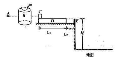 1、计算题 (18分)如图所示,质量为m1=0.01Kg的子弹A,垂直纸筒的旋转轴穿过高速旋转的纸筒B且只在B上留下一个弹孔,子弹穿过B后打入质量为m2=0.99Kg的木块C中,并在C里面(A、C可视为质点)。木块C放在长木板D的左端,D的质量m3=3kg,长度为L1=0.375m。长木板刚在光滑的水平桌面上,水平桌面的右端有一很薄的与D等高的固定挡板E,D的右端到E距离L2=0.125m,D碰到即被粘牢,C则离开D飞到桌面下方的水平地面上。已知纸筒直径d=30cm,纸筒匀速旋转的角速度