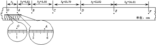 1、填空题 如图所示,是某同学在探究小车做匀变速直线运动规律时用打点计时器打得纸带的一部分,纸带上标注了几个计数点O、A、B、C、D、E、F,并且相邻两个计数点之间还有4个点没有画出,纸带旁还给出了最小刻度为1mm的刻度尺,已知打点计时器所用交流电频率为50Hz,即打点周期为0.02s.