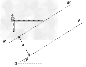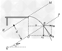4、计算题  如图所示,光滑的平台水平固定,在平台右下方有相互平行的两条边界MN与PQ,其距离为d=1.36m,MN过平台右端并与水平方向呈θ=37°.在平台最左端放一个可视为质点的A球,其质量为mA=0.1kg,现给A球一水平初速度,使其飞出平台后,能垂直PQ边界飞出.已知g=10m/s2,sin37°=0.6,cos37°=0.8.求:
