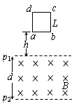 3、选择题 如图所示,相距为d的两水平虚线p1、p2表示方向垂直纸面向里的匀强磁场的上下边界,磁场的磁感应强度为B。正方形线框abcd的边长为L(L<d)、质量为m、电阻为R,线框处在磁场正上方,ab边与虚线p1相距h。线框由静止释放,下落过程中线框平面始终在竖直平面内,线框的ab边刚进人磁场时的速度和ab边刚离开磁场时的速度相同。在线框从进入到全部穿过磁场的过程中,下列说法正确的是