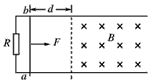 1、计算题 如图所示,两根平行金属导轨固定在同一水平面内,间距为l,导轨左端连接一个电阻R。一根质量为m、电阻为r的金属杆ab垂直放置在导轨上。在杆的右方距杆为d处有一个匀强磁场,磁场方向垂直于轨道平面向下,磁感应强度为B。对杆施加一个大小为F、方向平行于导轨的恒力,使杆从静止开始运动,已知杆到达磁场区域时速度为v,之后进入磁场恰好做匀速运动。不计导轨的电阻,假定导轨与杆之间存在恒定的阻力。求: