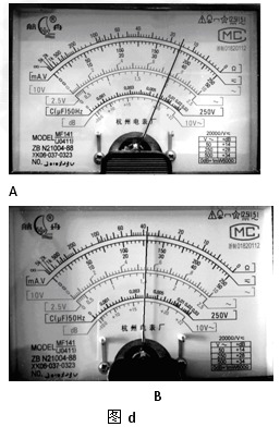 d、在测量途中,突然教室的灯熄灭了,图d所示为灯熄灭前与熄灭后的指针指示,则? (填A或B)是灯熄灭后的读数。