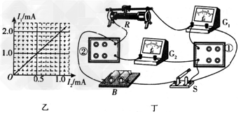 (1)实验中,先用图甲所示的电路测定电流表G2的内阻。将RP调为500.0 Ω接入电路起保护作用,调节滑动变阻器R,得到多组电流表G1和G2的示数I1和I2如下表所示: