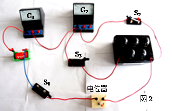 (2)小华认为利用第(1)题的电路也可以求得电池的内电阻,但是由于G表内阻未知,不是很精确,为了精确测量出电池的内电阻应先测出G表内阻Rg。他按照图2连好电路(其中电位器相当于阻值极大的滑动变阻器,G1、G2为与G完全相同的电表),请在下面的方框图中画出图2中的电路原理图。实验中的具体操作如下: