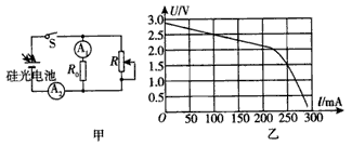 3、实验题 2010年世博会在上海举行,本次世博会大量采用低碳环保技术,太阳能电池用作照明电源是其中的亮点之一。硅光电池是太阳能电池的一种,某同学为了测定某种硅光电池的电动势和内电阻,设计了如图甲所示电路,在一定强度的光照下进行测量,图中与A1串联的定值电阻的阻值R0=990 kΩ。