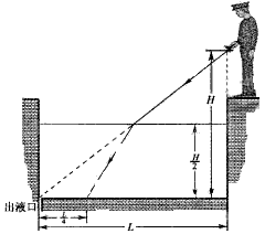 2、计算题 如图所示,巡查员站立于一空的贮液池边,检查池角处出液口的安全情况。已知池宽为L,照明灯到池底的距离为H。若保持照明光束方向不变,向贮液池中注入某种液体,当液面高为H/2时,池底的光斑距离出液口L/4。