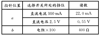 4、实验题 用多用电表进行了几次测量,指针分别处于a、b的位置,如图所示。若多用电表的选择开关处于下面表格中所指的档位,a和b的相应读数是多少?请填在表格中。