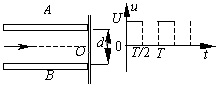 1、简答题 如图所示,两块平行金属板,相距为d.加上如图所示的电压,电压的最大值为U,周期为T.现有一束离子束,其中每个粒子的电量为q、质量为m,从与两板等距处沿两板平行的方向连续射入,设粒子通过平行板间区域所用的时间为T(与电压的变化周期相同),且所有的粒子都可以通过两板间的空间而打到右端的靶上.