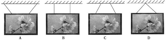2、选择题 用两条细绳把一个镜框悬挂在墙上,在如图所示的四种挂法中,细绳对镜框拉力最小的是