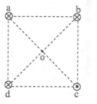 5、选择题  已知长直通电导线在其周围某点产生磁场的磁感应强度与该 导线中的电流成正比,与该点到导线的距离成反比。如图所示,a、b、c、d四根长直通电导体棒平行放置,它们的横截 面构成一个正方形,O为正方形中心,a、b、d中电流方向?垂直纸面向里,c中电流方向垂直纸面向外,电流大小满足: Ia=Ic=Id<Ib,则关于a、b、c、d长直通电导线在O点产生合磁场的方向可能是