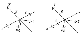 当F从此值开始增加时,静摩擦力方向开始仍然斜向上,但大小减小,当F增加到Fcosθ=mgsinθ时,即F=mg·tgθ时,F再增加,摩擦力方向改为斜向下,仍可以根据受力分析图列出方程