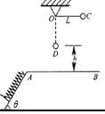 3、计算题 如图所示,在同一竖直平面内,一个轻质弹簧静止放于光滑斜面上,一端固定,另一端自由放置,且恰好与水平线AB齐平。一长为L的轻质细线一端固定在O点,另一端系一个质量为m的小球,将细线拉至水平,此时小球在位置C,由静止释放小球,小球到达最低点D时,细绳刚好被拉断, D点到AB的距离为h,之后小球恰好沿斜面方向将弹簧压缩,弹簧的最大压缩量为x.求: