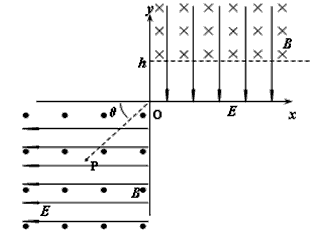 3、计算题 如图所示,位于竖直平面内的坐标系xoy,在其第三象限空间有沿水平方向的、垂直于纸面向外的匀强磁场,磁感应强度大小为B=0.5T,还有沿x轴负方向的匀强电场,场强大小为E=2N/C。在其第一象限空间有沿y轴负方向的、场强大小也为E的匀强电场,并在y>h=0.4m 的区域有磁感应强度也为B的垂直于纸面向里的匀强磁场。一个带电荷量为q的油滴从图中第三象限的P点得到一初速度,恰好能沿PO作匀速直线运动(PO与x轴负方向的夹角为θ=45o),并从原点O进入第一象限。已知重力加速度g=10m/s2,问: