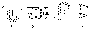 参考答案:解法一:平衡法,选与气体接触的液柱为研究对象,进行受力分析,利用平衡条件求解 本题解析: 本题难度:一般 3、选择题 如图所示,A、B两点表示一定质量的某种气体的两个状态。气体自状态A变化到状态B的过程中 参考答案:A 本题解析: 本题难度:一般 4、简答题 如图,在一个气缸内用活塞封闭了一定质量的理想气体,活塞和柄的总质量为m,活塞的面积为S.当活塞自由放置时,气体体积为V,温度为T.现缓慢地用力向下推动活塞,使气体的体积减少为0.5V,已知大气压强为p0,求: 参考答案:(1)开始时的压强p1=p0+mgS, 本题解析: 本题难度:一般 5、选择题 如图所示,4只管中A端有封闭气体,气体的压强分别为pa、pb、pc、pd,它们的大小顺序为(?) 参考答案:B 本题解析:液体相连在等高处压强相等,必须注意的是不能把气体和液体“连通” 本题难度:简单 No song, no supper. 不出力,不得食. |