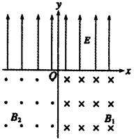,在第Ⅲ、Ⅳ象限中,存在垂直于xOy平面方向的匀强磁场,如图所示,磁感应强度B1=B,B2=2B.带电粒子a、b分别从第Ⅰ、Ⅱ象限的P、Q两点(图中没有标出)由静止释放,结果两粒子同时分别进入匀强磁场B1、B2中,再经过时间t第一次经过y轴时恰在点M(0,-