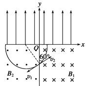 本题解析: (1)粒子运动轨迹如图.两粒子在磁场中运动时间相等且为t,即t1=t2=t