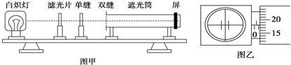 5、简答题 在用双缝干涉测光的波长的实验中,所用实验装置如图甲所示,调节分划板的位置,使分划板中心刻线对齐某条亮条纹(并将其记为第一条)的中心,如图乙所示,此时手轮上的读数为______mm;转动手轮,使分划线向右侧移动到第四条亮条纹的中心位置,读出手轮上的读数,并由两次读数算出第一条亮条纹到第四条亮条纹之间的距离a=9.900mm,又知双缝间距d=0.200mm,双缝到屏的距离l=1.000m,则对应的光波的波长为_______m.