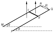 1、计算题 如图所示,两足够长平行光滑的金属导轨MN、PQ相距为L,导轨平面与水平面夹角α=30°,导轨上端跨接一定值电阻R,导轨电阻不计。整个装置处于方向竖直向上的匀强磁场中,长为L的金属棒cd垂直于MN、PQ放置在导轨上,且与导轨保持电接触良好,金属棒的质量为m、电阻为r,重力加速度为g,现将金属棒由静止释放,当金属棒沿导轨下滑距离为s时,速度达到最大值vm。求: