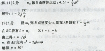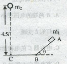 1、计算题 如图所示,m1从光滑的斜面上的A点由静止开始运动,与此同时小球m2在C点的正上方4.5l处自由落下,m1以不变的速率途经斜面底端B点后继续在光滑的水平面上运动,在C点恰好与自由下落的小球m2相遇,若AB= BC=l,不计空气阻力,试求: