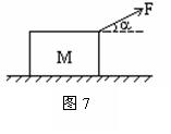 4、计算题 (10分)如图7所示,位于水平地面上的质量为M的小木块,在大小为F,方向与水平方向成
