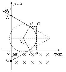 5、计算题 如图所示,第四象限内有互相正交的匀强电场E与匀强磁场B1, E的大小为0.5×103V/m, B1大小为0.5T;第一象限的某个矩形区域内,有方向垂直纸面向里的匀强磁场B2,磁场的下边界与x轴重合.一质量m=1×10-14kg、电荷量q=1×10-10C的带正电微粒以某一速度v沿与y轴正方向60°角从M点沿直线运动,经P点即进入处于第一象限内的磁场B2区域.一段时间后,小球经过y轴上的N点并与y轴正方向成60°角的方向飞出。M点的坐标为(0,-10),N点的坐标为(0,30),不计粒子重力, g取10m/s2.
