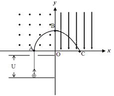 3、计算题 如图,在xoy直角坐标系中,在第三象限有一平行x轴放置的平行板电容器,板间电压U=1×102V。现有一质量m=1.0×10-12kg,带电量q=2.0×10-10C的带正电的粒子(不计重力),从下极板处由静止开始经电场加速后通过上板上的小孔,垂直x轴从A点进入第二象限的匀强磁场中。磁场方向垂直纸面向外,磁感应强度B=1T。粒子在磁场中转过四分之一圆周后又从B点垂直y轴进入第一象限,第一象限中有平行于y轴负方向的匀强电场E,粒子随后经过x轴上的C点,已知OC=1m。求:
