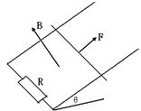 4、选择题 如图所示,两根足够长的平行光滑金属导轨与水平方向成θ角放置,下端接有电阻R,一根质量为m的导体棒垂直放置在导轨上,与导轨保持良好接触,匀强磁场垂直导轨平面向上,导体棒在外力作用下向上匀速运动。不计导体棒和导轨的电阻,则下列说法正确的是