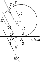方向跟y轴负向成30°,y的右边有一垂直纸面向里的匀强磁场,磁感应强度为B.现有一质子,以一定的初速度v0,在x 轴上坐标为x0=10cm处的A点,第一次沿x轴正方向射入磁场,第二次沿x轴负方向射入磁场,回旋后都垂直于电场方向射入电场,最后又进入磁场。求: