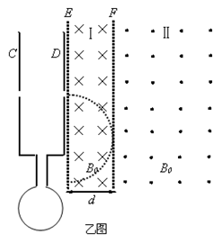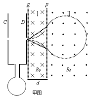 (Ⅰ)如果离子从小孔下面离开磁场,运动轨迹与F相切,如图(乙)所示