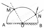 5、计算题 一半圆柱形透明物体横截面如图所示,地面AOB镀银,(图中粗线),O表示半圆截面的圆心,一束光线在横截面内从M点的入射,经过AB面反射后从N点射出,已知光线在M点的入射角为30