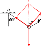 2、选择题  如图所示,一小球用轻绳悬于O点,用力F拉住小球,使悬线保持偏离竖直方向60°角,且小球始终处于平衡状态。为了使F有最小值,F与竖直方向的夹角θ应该是