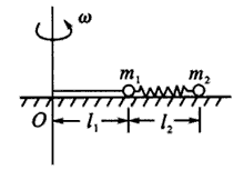 5、选择题 如图所示,在光滑水平面上,有质量为m1,m2的两只小球用轻弹簧连接在一起,再用长为l1的细线一端拴住m1,一端拴在O点上,m1和m2 两球都以相同的角速度ω绕O点做匀速圆周运动,保证m1,m2两球与O点三者始终在同一条半径上,若m1,m2两球之间的距离为l2,试求细线的拉力以及将细线烧断的瞬间两球的加速度.