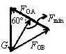 (2)以结点O为研究对象,分析受力可知:O点受三个力作用,重物对结点向下的拉力F=G,大小和方向都不变;左侧轻绳OA’的拉力FOA,其方向保持不变;右侧轻绳OB’的拉力拉力FOB.缓慢将右侧轻绳从OB’沿圆周移动时三力保持平衡.如图,由矢量三角形可知,当右侧轻绳移动到与左侧轻绳垂直时,右侧轻绳中的拉力最小,此时右侧轻绳与水平方向的夹角为θ=60°.由矢量直角三角形可知,拉力的最小值为:Fmin=Gsin60°=20