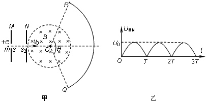 ,板M、N上的小孔s1、s2与O三点共线,s2O=R,连线s1O垂直于板M、N。以O为圆心、R为半径的圆形区域内存在磁感应强度大小为B、方向垂直纸面向里的匀强磁场。收集屏PQ上各点到O点的距离都为2R,两端点P、Q关于连线s1O对称,屏PQ所对的圆心角θ=120°。质量为m、电荷量为e的质子连续不断地经s1进入M、N间的电场,接着通过s2进入磁场。质子重力及质子间的相互作用均不计,质子在s1处的速度看作零。
