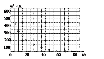 按照图中的点,用光滑曲线把它们依次连接起来,得到i-t图线,图线和横轴所围的面积就是放电量,即原来电容器的带电量。每小格相当于2.5×10-4C,用四舍五入法数得小方格有32个,所以Q0=8×10-3C。再由C= Q0/ U0,得C=1.3×10-3F。