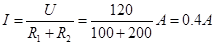 4、选择题  如图所示的电路中,U ="120" V,R1 =100Ω,R2 =200Ω,则a、b两端的电压为