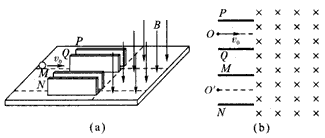 5、计算题 如图(a)所示,在光滑绝缘的水平面上固定着两对几何形状完全相同的平行金属板PQ和MN,P、Q与M、N四块金属板相互平行地竖直地放置,其俯视图如图(b)所示。已知P、Q之间以及M、N之间的距离都是d =0.2m,极板本身的厚度不计,板板长均为L=0. 2m,P、Q之间以及M、N之间的电压都是U=6.0×102V。金属板右侧为竖直向下的匀强磁场,磁感应强度B=5×102T,磁场区域足够大。今有一质量为m=1×10-4kg,电量为q=2×10-6 C 的带负电小球在水平面上从PQ平行板间左侧中点O沿极板中轴线以初速度v0=4 m/s进入平行金属板PQ。 (1)试求小球刚穿出平行金属板PQ进入磁场瞬间的速度大小; (2)若要小球穿出平行金属板PQ后,经磁场偏转射入平行金属板MN中,且在不与极板相碰的前提下,最终在极板MN的左侧中点O"沿中轴线射出。已知Q板电势高于P板,则金属板Q、M间距离是多少?