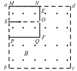5、实验题 (13分) 如图,边长L="0.2" m的正方形abcd区域(含边界)内,存在着垂直于区域的横截面(纸面)向外的匀强磁场,磁感应强度B=5.0×10-2T。带电平行金属板MN、PQ间形成了匀强电场E(不考虑金属板在其它区域形成的电场),MN放在ad边上,两板左端M、P恰在ab边上,两板右端N、Q间有一绝缘挡板EF。EF中间有一小孔O,金属板长度、板间距、挡板长度均为l="0.l" m。在M和P的中间位置有一离子源S,能够正对孔O不断发射出各种速率的带正电离子,离子的电荷量均为q=3.2×l0-19 C,质量均为m=6.4×l0-26 kg。不计离子的重力,忽略离子之间的相互作用及离子打到金属板或挡板上后的反弹。